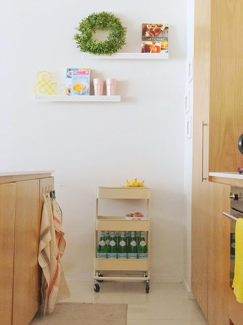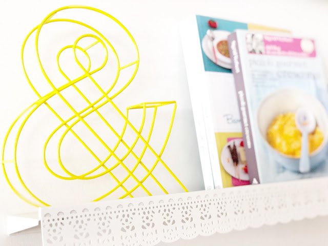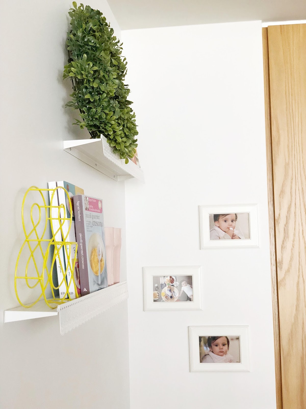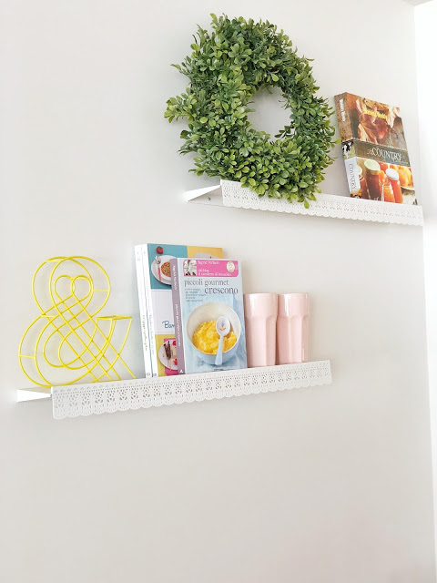 Chi mi conosce sa che tra le mie passioni c’é anche l’ home decor! Mi piace decorare casa, qualsiasi stanza e curare i dettagli! Una parete bianca non riesco a lasciarla cosi’ per tanto tempo, preferisco arredare con semplicita’, con colori alla moda ma che devono sempre rispecchiare i miei gusti. Vi voglio far vedere infatti l’ultima decorazione che ho fatto in cucina. La mia casa ha due piani e la living room e’ tutta open space. Su una parete nell’ area della cucina, vicino alla dispenza dove ci sono alcuni quadretti con foto di Vittoria, ho appeso due mensole bianche, semplici che ho decorato con alcuni libri di cucina in italiano e in inglese.
