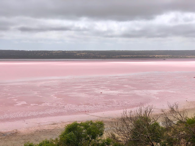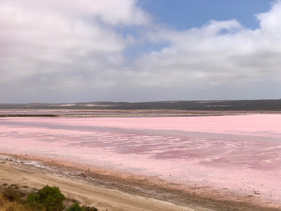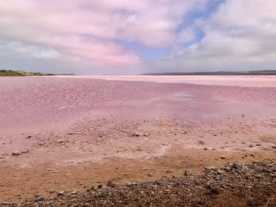 Il giorno dopo siamo andati a Port Gregory, poco distante da Kalbarry, per visitare il lago rosa (The Pink Lake), chiamato così per il colore delle alghe che producono beta-carotene. In base all’orario, alla stagione ed a quanto il cielo è coperto dalle nuvole, il colore del lago varia tra i colori del rosso, rosa bubble-gum, lilla o viola scuro. È di un fascino pazzesco!