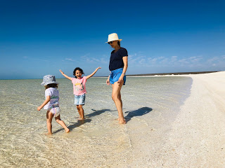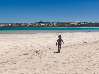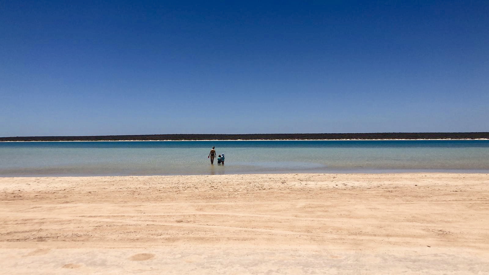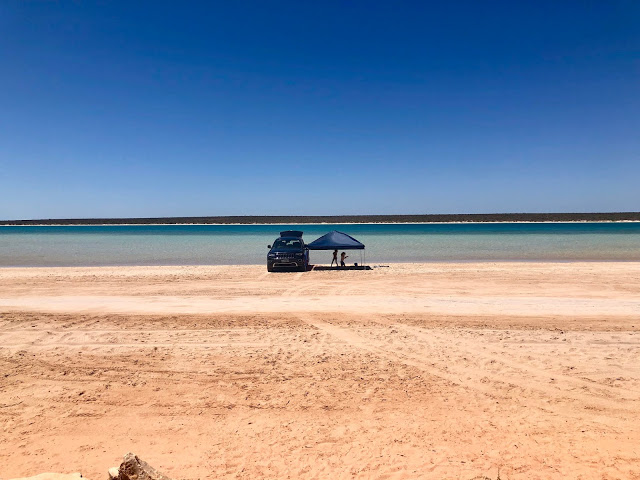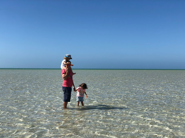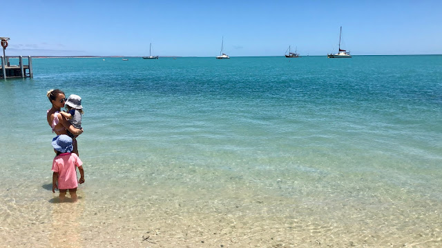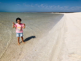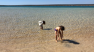 La tappa seguente è stata Denham (480 Km), alla scoperta di Monkey Mia per incontrare i delfini, ma durante il tragitto poco prima di arrivare, non abbiamo potuto fare a meno di fermarci a Shell Beach, il nome è dato proprio dal fatto che la spiaggia è completamente piena di conchiglie ed un mare molto basso e da sogno.