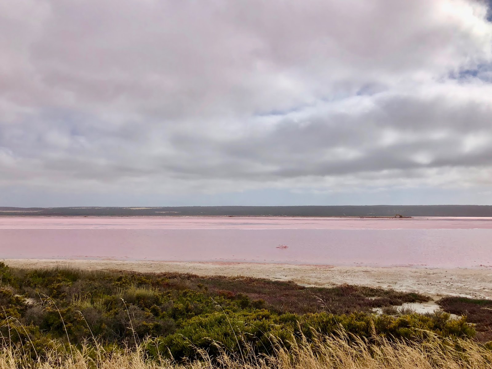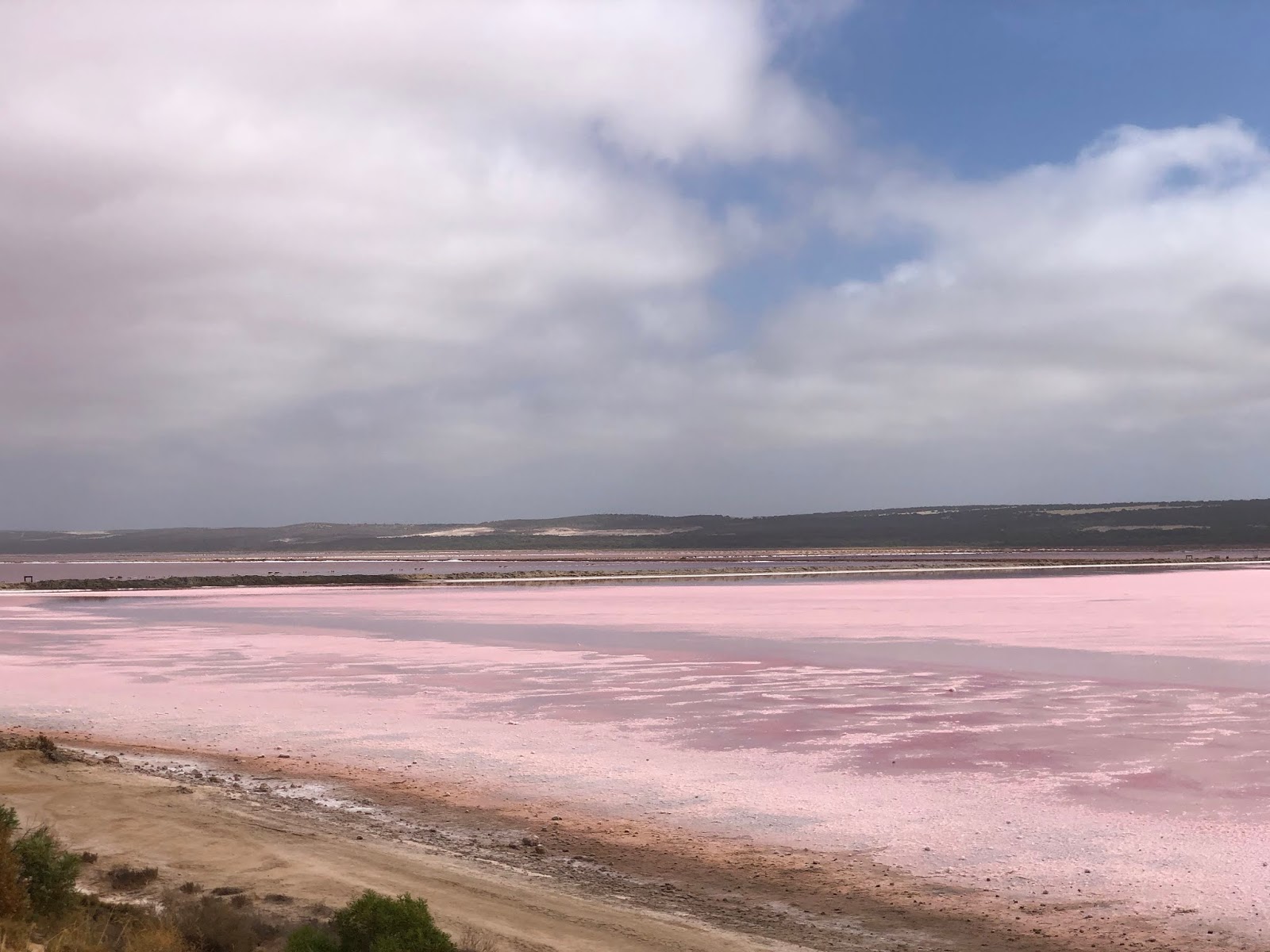 Il giorno dopo siamo andati a Port Gregory, poco distante da Kalbarry, per visitare il lago rosa (The Pink Lake), chiamato così per il colore delle alghe che producono beta-carotene. In base all’orario, alla stagione ed a quanto il cielo è coperto dalle nuvole, il colore del lago varia tra i colori del rosso, rosa bubble-gum, lilla o viola scuro. È di un fascino pazzesco!